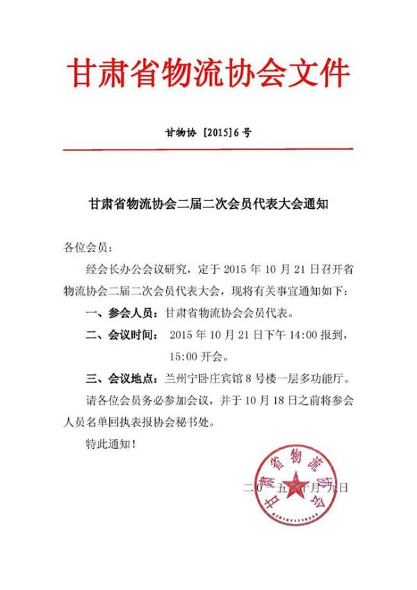 甘肅省物流協(xié)會二屆二次會員代表大會通知